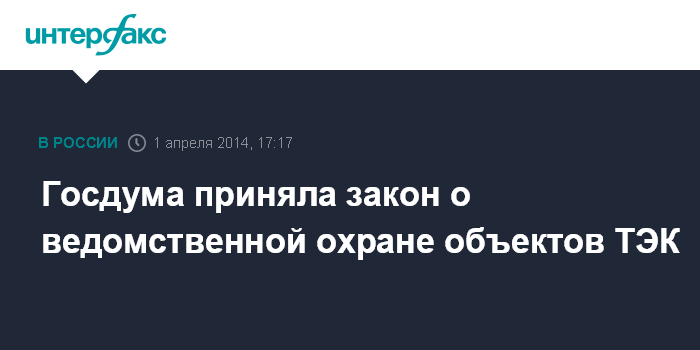 Москва. 1 апреля. INTERFAX.RU - Госдума РФ на пленарном заседании во вторник приняла во втором и третьем чтениях закон, который закрепляет право таких компаний, как "Газпром", "Транснефть", "Роснефть", создать ведомственную охрану для обеспечения безопасности объектов ТЭК, предназначенных для добычи, переработки, транспортировки, хранения продукции, поставляемой по госконтракту.