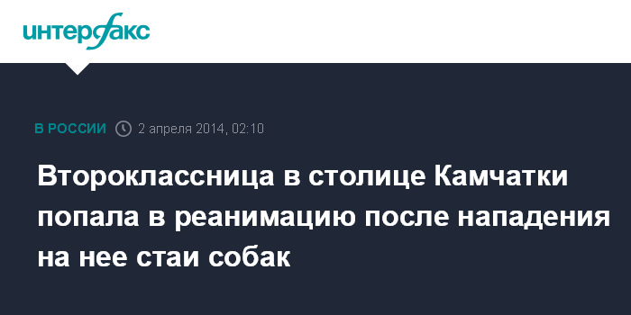 Петропавловск-Камчатский. 2 апреля. INTERFAX.RU - Восьмилетняя девочка госпитализирована с множественными ранами в реанимационное отделение больницы после нападения стаи бродячих собак в жилом районе Петропавловска-Камчатского, сообщила агентству "Интерфакс - Дальний Восток" сотрудник пресс-службы УМВД по Камчатскому краю Елена Овчинникова.