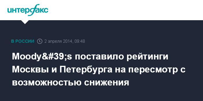 Москва. 2 апреля. INTERFAX.RU - Moody's Investors Service поставило рейтинги Москвы Baa1 и Санкт-Петербурга Baa1 на пересмотр с возможностью снижения, говорится в сообщении рейтингового агентства.