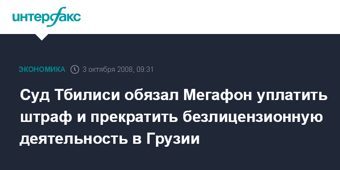 Москва. 3 октября. INTERFAX.RU - Коллегия по административным делам Тбилисского городского суда на заседании в четверг не удовлетворила иск российского ОАО "Мегафон" (РТС: MEGF) к национальной комиссии коммуникаций Грузии (GNCC), применившей в отношении российской компании штрафные санкции за незаконную деятельность на территории страны, сообщил "Интерфаксу" глава GNCC Георгий Арвеладзе.