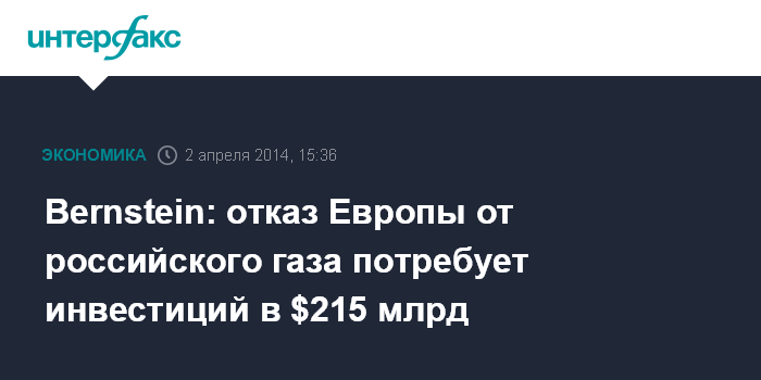 Москва. 2 апреля. INTERFAX.RU - Отказ Европы от поставок российского газа повлечет за собой необходимость в инвестициях на сумму до $215 млрд, сообщает агентство Bloomberg со ссылкой на обзор Sanford C. Bernstein & Co.