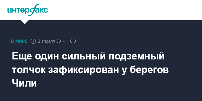 Новосибирск. 2 апреля. INTERFAX.RU - Еще один подземный толчок магнитудой 5,7 зафиксирован у побережья Чили, сообщает Геофизическая служба Сибирского отделения РАН.