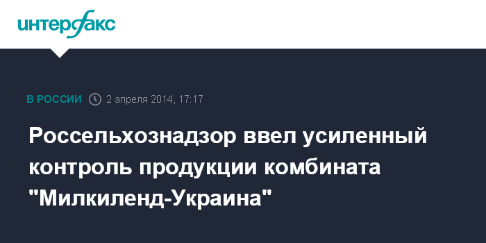 Москва. 2 апреля. INTERFAX.RU - Россельхознадзор ввел режим усиленного лабораторного контроля в отношении продукции "Славутского маслодельного комбината" ЧП "КФ "Прометей", который принадлежит компании "Милкиленд-Украина".