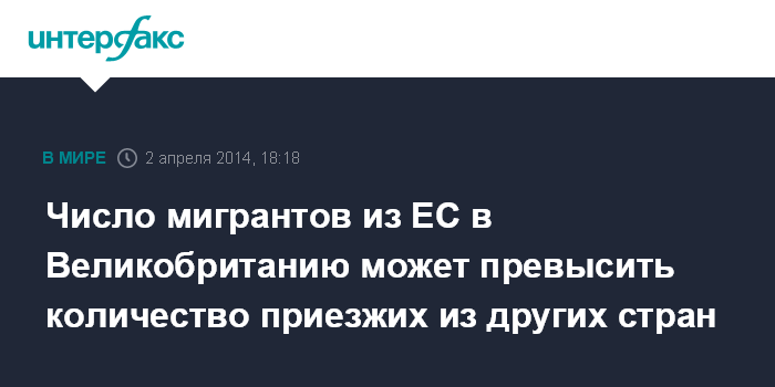 Лондон. 2 апреля. INTERFAX.RU - Количество иностранцев, приезжающих в Великобританию из Евросоюза, может превысить число мигрантов из других стран уже в следующем месяце, сообщает агентство Bloomberg со ссылкой на отчет организации MigrationWatch.