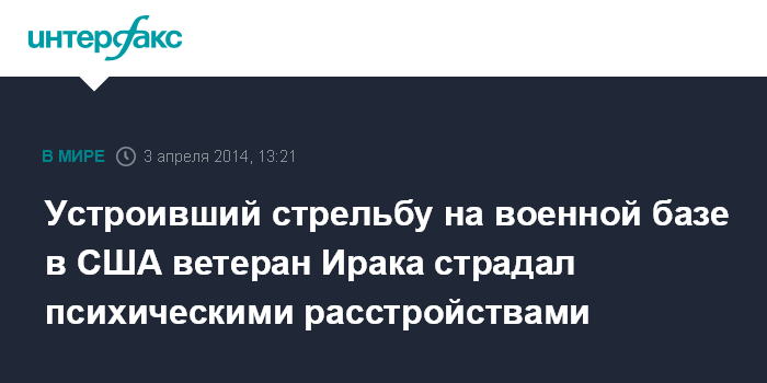 Вашингтон. 3 апреля. INTERFAX.RU - Военный, устроивший стрельбу на базе Форт-Худ армии США в штате Техас, проходил курс лечения от психических заболеваний, сообщили в четверг журналистам американские официальные лица.