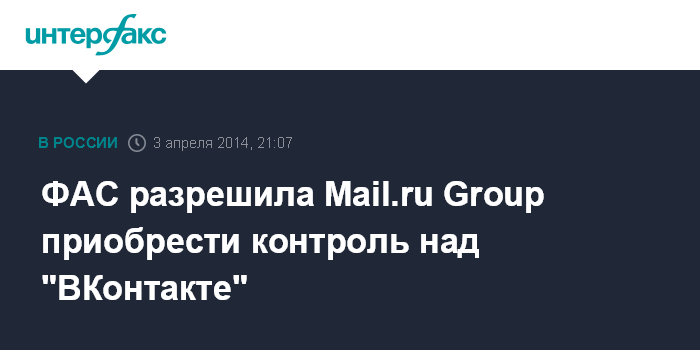 Москва. 3 апреля. INTERFAX.RU - Федеральная антимонопольная служба (ФАС) опубликовала положительное решение по ходатайству Mail.ru Group Ltd. о "приобретении прав, позволяющих определять условия осуществления предпринимательской деятельности ООО "В контакте".