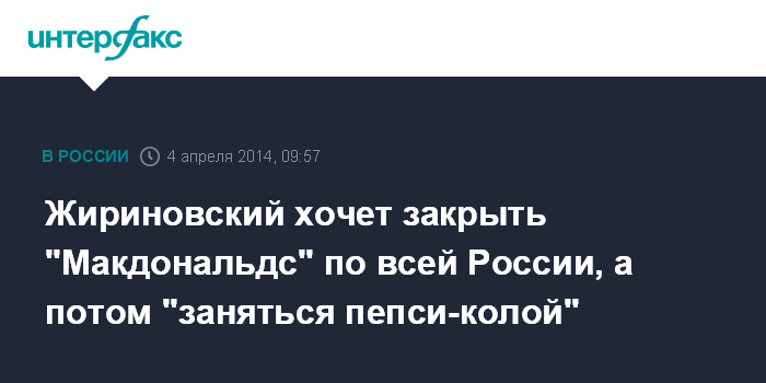 Он также добавил, что обязательно добьется закрытия ресторанов "Макдональдс" "по всей стране". "Чтоб духу не было. Потом пепси-колой займемся", - добавил лидер ЛДПР.