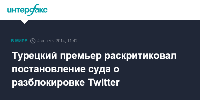 Москва. 4 апреля. INTERFAX.RU - Премьер-министр Турции Реджеп Тайип Эрдоган в пятницу обрушился с критикой на постановление конституционного суда, который признал незаконным решение правительства заблокировать доступ к Twitter.