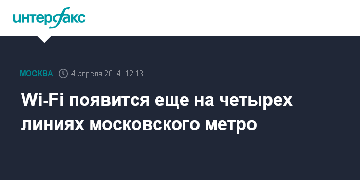 Москва. 4 апреля. INTERFAX.RU - За второй и третий кварталы 2014 года связь Wi-Fi появится еще на четырех ветках московского метро, сообщили в пресс-службе столичного департамента транспорта и развития дорожно-транспортной инфраструктуры.
