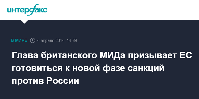Москва. 4 апреля. INTERFAX.RU - Глава МИД Великобритании Уильям Хэйг заявил, что ЕС должен быть готов к введению третьей фазы санкций против России.