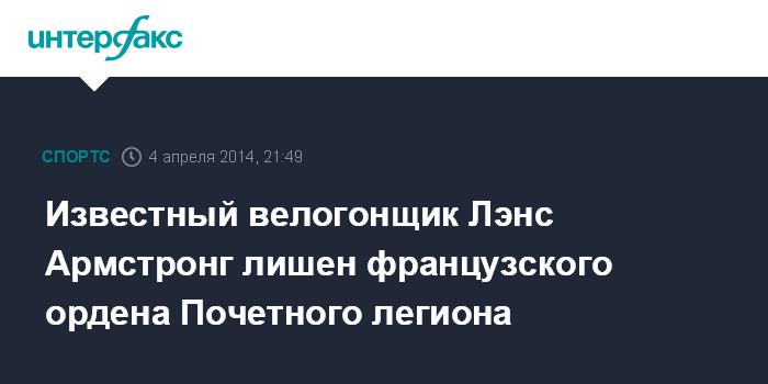 Москва. 4 апреля. INTERFAX.RU - Власти Франции приняли решение лишить бывшего американского велогонщика Лэнса Армстронга ордена Почетного легиона в связи с тем, что спортсмен был признан виновным в употреблении допинга, сообщает в пятницу французская газета Le Figaro.