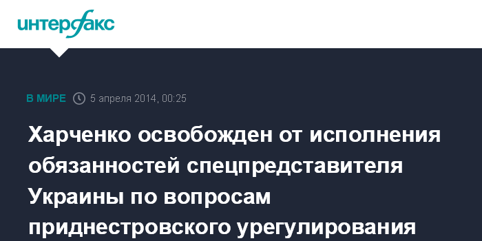 Киев. 5 апреля. ИНТЕРФАКС-УКРАИНА - И.о. президента Украины, председатель Верховной Рады Александр Турчинов освободил Игоря Харченко от исполнения обязанностей специального представителя Украины по вопросам приднестровского урегулирования.