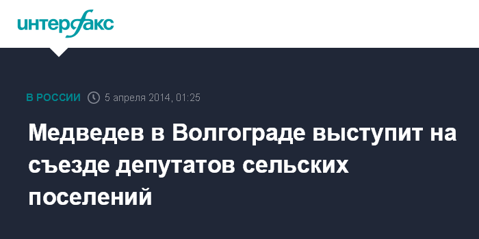 Москва. 5 апреля. ИНТЕРФАКС - Премьер РФ Дмитрий Медведев в субботу в Волгограде выступит на заседании всероссийского Съезда депутатов сельских поселений России, встретится с ведущими дискуссионных площадок съезда, сообщили в пресс-службе правительства.