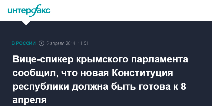 Москва. 5 апреля. INTERFAX.RU - Текст новой Конституции Крыма должен быть готов к 8 апреля, сообщил председатель конституционной комиссии, вице-спикер крымского парламента Григорий Иоффе.