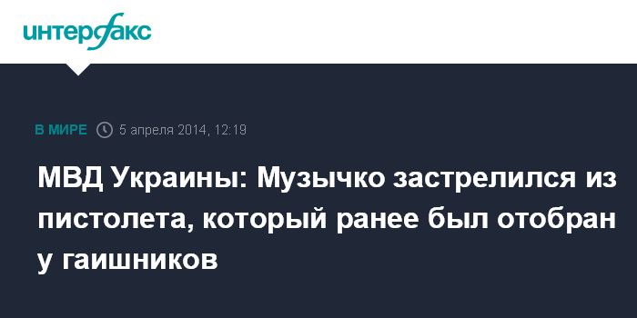 Москва. 5 апреля. INTERFAX.RU - Координатор ультрарадикального движения "Правый сектор" в Западной Украине Александр Музычко (Сашко Билый) во время борьбы с силовиками застрелился из пистолета, который ранее был отобран у сотрудников ГАИ.