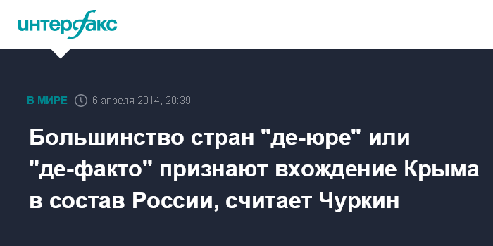 "Это новый геополитический факт: Крым вошел в состав России. И здесь, как мне кажется, необходимости в какой-то особой энергичной кампании не возникает, поскольку подавляющее число стран или "де-юре", или "де-факто", признают вхождение Крыма в состав России", - заявил В.Чуркин в воскресенье в интервью итоговой программе "Сегодня" телеканала НТВ.