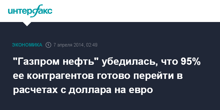 Москва. 7 апреля. INTERFAX.RU - "Газпром нефть" убедилась, что 95% ее контрагентов готово перейти в расчетах с доллара на евро, сообщил журналистам глава "Газпром нефти" Александр Дюков.