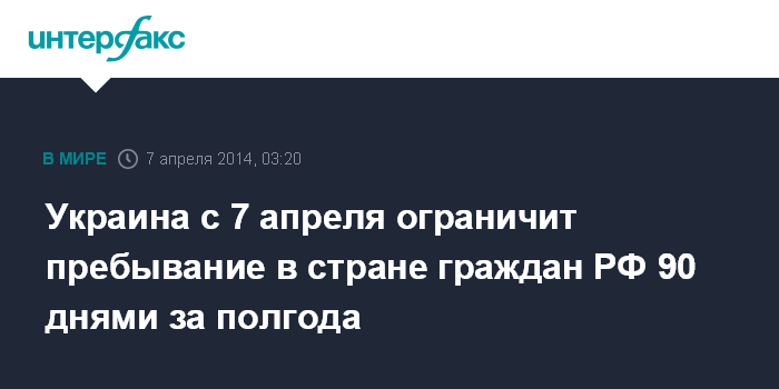 Москва. 7 апреля. INTERFAX.RU - С 7 апреля граждане РФ могут временно находиться в Украине не более 90 дней на протяжении 180 дней с даты первого въезда.