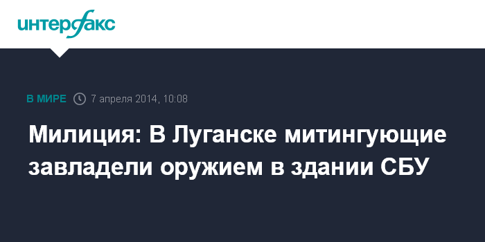 Москва. 7 апреля. INTERFAX.RU - Неизвестные, находящиеся в здании управления Службы безопасности Украины в Луганске, захватили комнату вооружения и завладели оружием, сообщает пресс-служба Главного управления МВД в Луганской области.