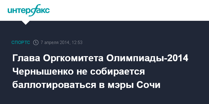 Москва. 7 апреля. INTERFAX.RU - Глава Оргкомитета "Сочи 2014" Дмитрий Чернышенко заявил, что у него нет планов в дальнейшем продолжать работу в области спорта. А отвечая на вопрос о том, поддержит ли он инициативу его выдвижения на пост мэра города Сочи, заметил, что не планирует продолжать свою деятельность и в этой роли.