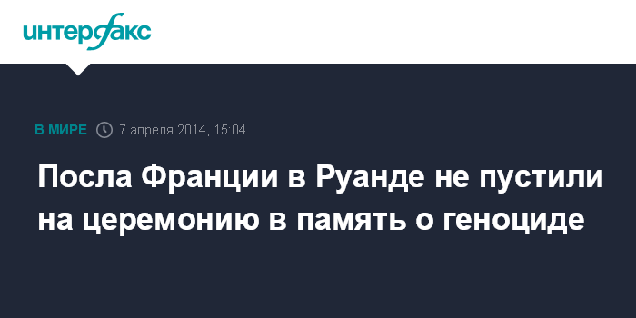 Москва. 7 апреля. INTERFAX.RU - Власти Руанды отказали послу Франции Мишелю Флеш в участии в церемонии, посвященной 20-летию геноцида, сообщает в понедельник агентство Associated Press.