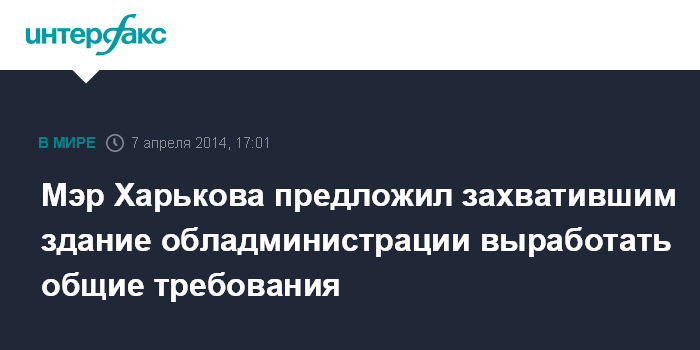Москва. 7 апреля. INTERFAX.RU - Активисты, занявшие здание Харьковской облгосадминистрации в воскресенье вечером, должны освободить его, считает городской голова Харькова Геннадий Кернес.