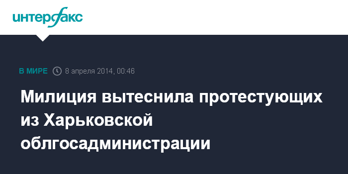 Харьков. 8 апреля. ИНТЕРФАКС-УКРАИНА – Сотрудники милиции вытеснили протестующих против новой киевской власти граждан из здания Харьковской облгосадминистрации, сообщил агентству "Интерфакс-Украина" источник в правоохранительных органах.