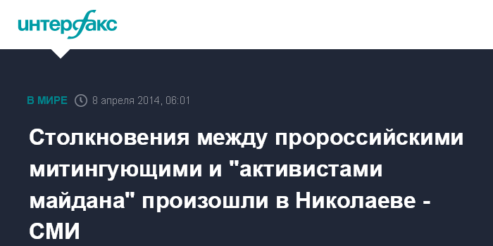 Киев. 8 апреля. ИНТЕРФАКС-УКРАИНА - Активисты "самообороны майдана" и "народного ополчения" Николаева оттеснили пророссийски настроенных митингующих от здания Николаевской областной государственной администрации и разобрали их палаточный лагерь, сообщает местное интернет-издание "НикВести".