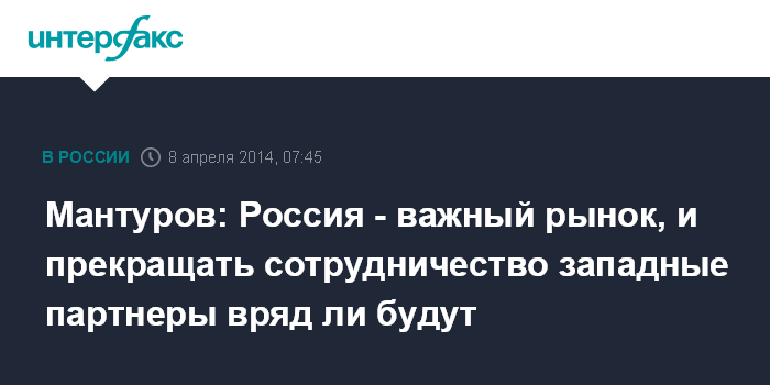 Мантуров: Россия - важный рынок, и прекращать сотрудничество западные партнеры вряд ли будут