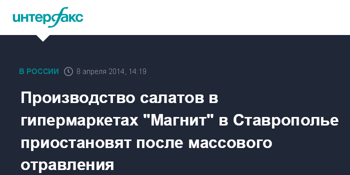 Пятигорск. 8 апреля. ИНТЕРФАКС-ЮГ - Горсуды Минвод и Георгиевска на Ставрополье вынесли решение о приостановке работы цехов для приготовления салатов в гипермаркетах "Магнит" в этих городах после массового отравления, сообщили агентству "Интерфакс-Юг" в пресс-службе краевого суда.