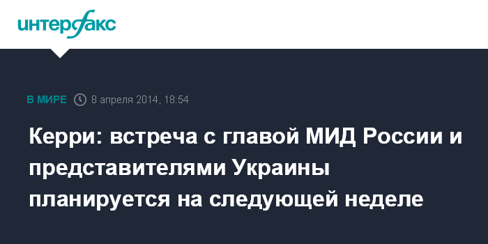 Москва. 8 апреля. INTERFAX.RU - Госсекретарь США Джон Керри заявил, что достиг договоренности с главой МИД РФ Сергеем Лавровым о проведении встречи по Украине на следующей неделе в Европе.