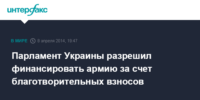 Москва. 8 апреля. INTERFAX.RU - Верховная рада Украины разрешила финансировать Вооруженные силы (ВСУ), мобилизационную подготовку и мероприятия по мобилизации за счет благотворительных взносов физических и юридических лиц.