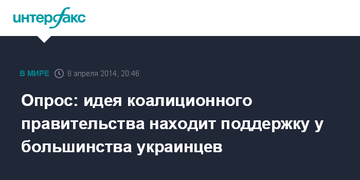 Москва. 8 апреля. INTERFAX.RU - Большинство украинцев (64%) поддерживают идею создания коалиционного правительства, в которое вошли бы представители всех ведущих политических сил из всех регионов страны, свидетельствуют данные опроса социологической группы "Рейтинг".