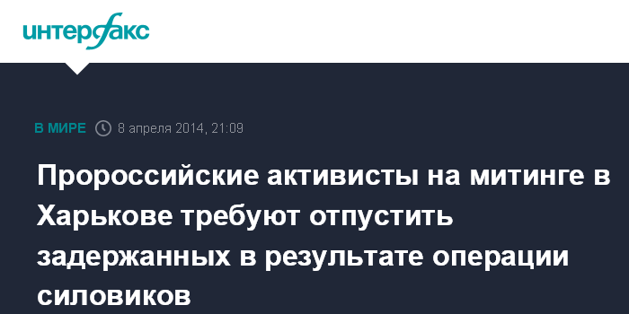 Как передает корреспондент агентства "Интерфакс-Украина", в акции принимают участие несколько сотен человек. К традиционному требованию провести местный референдум по вопросу федерализации и заявлениям о "незаконности киевской власти" добавилось требование освободить 64 человек, задержанных в результате операции силовиков.