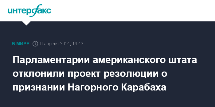 Баку 9 апреля. INTERFAX.RU - Комитет по правительственным делам сената американского штата Вермонт отклонил проект резолюции о признании незаконного сепаратистского режима Нагорно-Карабахского региона Азербайджана и принял решение не выносить указанный документ на рассмотрение сената, сообщают официальные азербайджанские СМИ.