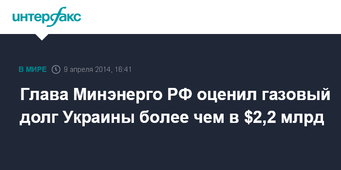Ново-Огарево. 9 апреля. INTERFAX.RU - Задолженность Украины за российский газ в настоящее время превысила $2,2 млрд.