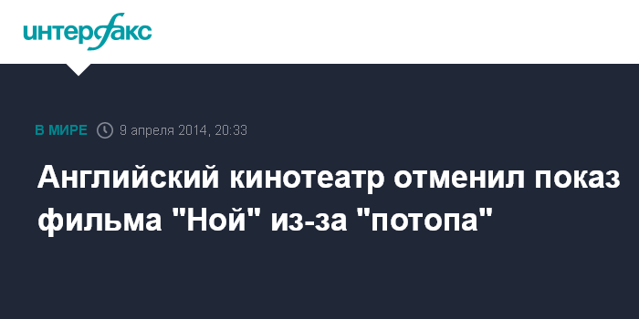 Москва. 9 апреля. INTERFAX.RU - Кинотеатр Vue Cinema в английском городе Эксетер был вынужден отменить показ фильма "Ной" с Расселом Кроу из-за небольшого "потопа", сообщает Time.