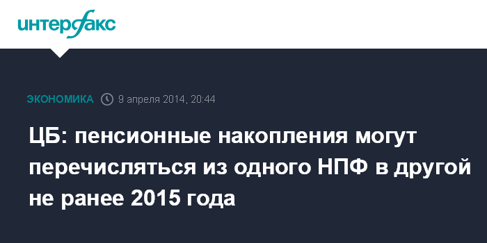 Москва. 9 апреля. INTERFAX.RU - Пенсионные накопления граждан, которые в 2013-2014 гг. направили в ПФР заявления о переходе из одного НПФ в другой, передаются в новый фонд не ранее 1 января 2015 года, говорится в информационном письме за подписью первого зампреда ЦБ РФ Сергея Швецова, текст которого разместил на своем сайте Банк России.