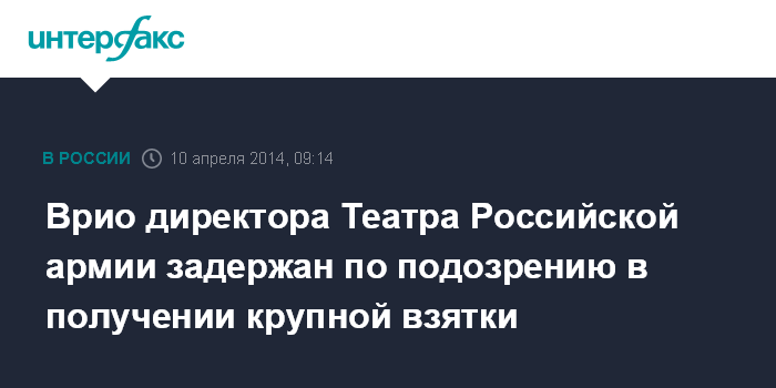 Москва. 10 апреля. INTERFAX.RU - Замдиректора Театра Российской армии задержан по подозрению в вымогательстве взятки, сообщили "Интерфаксу" в пресс-центре МВД России.