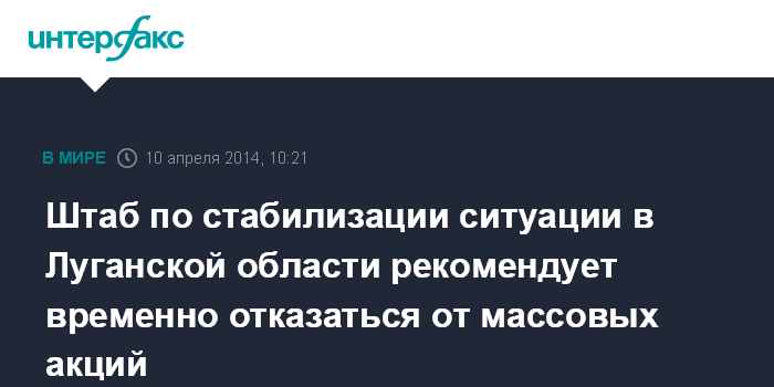 Москва. 10 апреля. INTERFAX.RU - Созданный новыми украинскими властями штаб по стабилизации общественно-политической обстановки и обеспечению общественного порядка в Луганской области рекомендовал политическим и общественным организациям региона временно отказаться от массовых акций, которые могут спровоцировать новый всплеск радикальных настроений.
