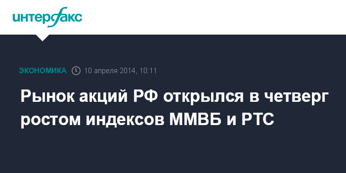 Москва. 10 апреля. INTERFAX.RU - Рынок акций РФ открылся в четверг ростом цен blue chips на фоне благоприятной конъюнктуры мировых фондовых площадок и отсутствия новых негативных новостей с Украины.