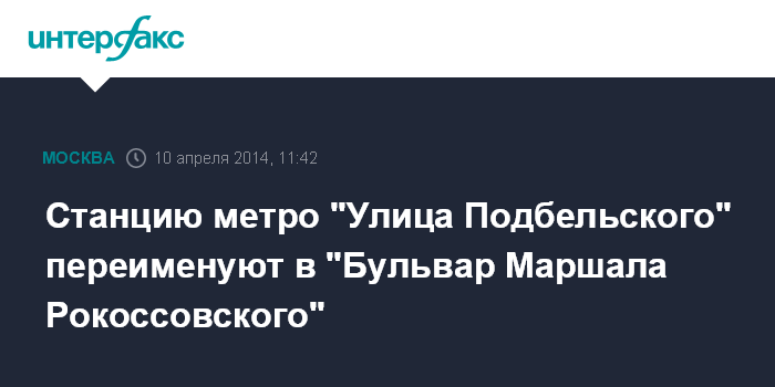 Москва. 10 апреля. INTERFAX.RU - Московская межведомственная комиссия по наименованию территориальных единиц, улиц, станций метрополитена, организаций и других объектов города приняла решение присвоить наименование "Бульвар Маршала Рокоссовского" существующей станции столичного метрополитена "Улица Подбельского".