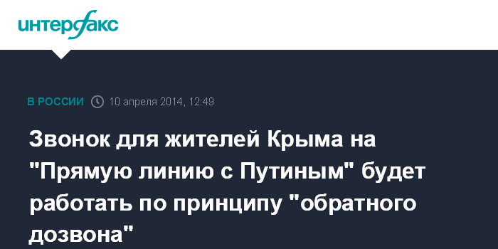 Москва. 10 апреля. INTERFAX.RU - Жители Крыма и Севастополя смогут бесплатно задать вопрос президенту РФ Владимиру Путину, "прямая линия" с которым состоится 17 апреля.
