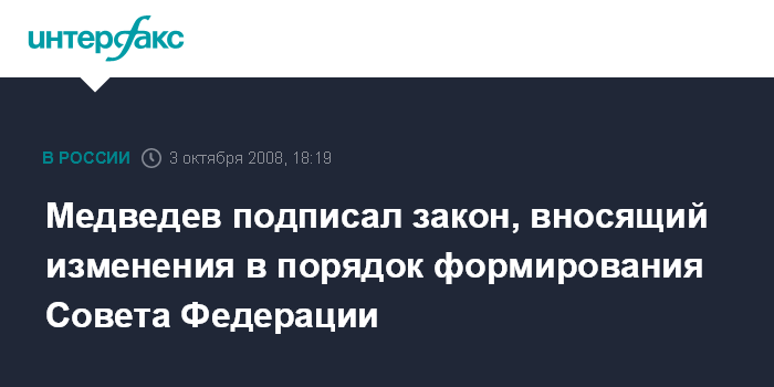 Москва. 3 октября. INTERFAX.RU - Президент России Дмитрий Медведев подписал Федеральный закон "О внесении изменений в статью 2 Федерального закона "О внесении изменения в статью 1 Федерального закона "О порядке формирования Совета Федерации Федерального Собрания Российской Федерации", принятый Государственной Думой 17 сентября 2008 года и одобренный Советом Федерации 19 сентября 2008 года, сообщили в пресс-службе главы государства.