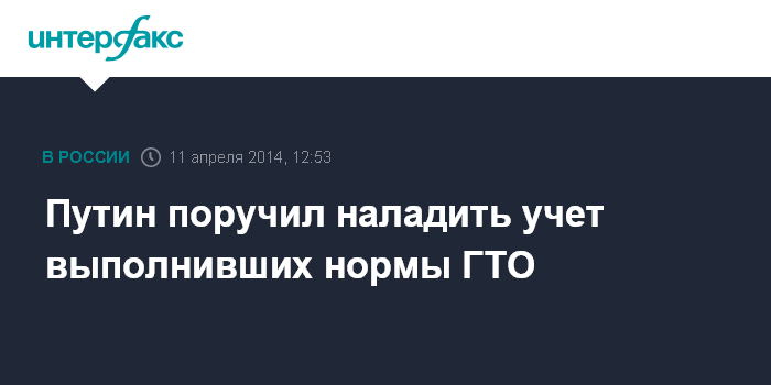 Москва. 11 апреля. INTERFAX.RU - Президент РФ Владимир Путин поручил правительству к 1 декабря текущего года наладить статистическое наблюдение за реализацией всероссийского физкультурно-спортивного комплекса "Готов к труду и обороне" (ГТО), а также учет граждан, выполнивших его нормативы.