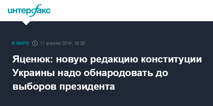 Москва. 11 апреля. INTERFAX.RU - Премьер-министр Украины Арсений Яценюк считает необходимым обнародовать новую редакцию Конституции до 25 мая - внеочередных президентских выборов.
