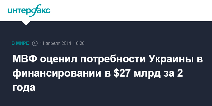 Вашингтон. 11 апреля. INTERFAX.RU - Международный валютный фонд (МВФ) оценивает потребности Украины в финансировании в $27 млрд на протяжении двух лет, заявил в пятницу директор Европейского департамента МВФ Реза Могадам на брифинге в Вашингтоне.