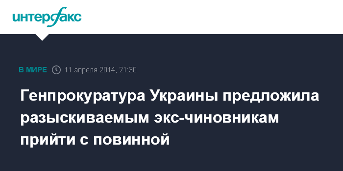 Киев. 11 апреля. INTERFAX.RU - В Генпрокуратуре Украины советуют всем разыскиваемым бывшим чиновникам прийти с явкой с повинной, иначе правоохранители предпримут меры, чтобы доставить их в принудительном порядке.