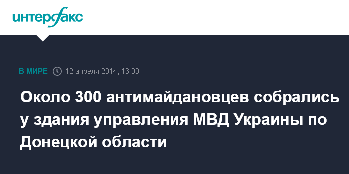 Москва. 12 апреля. INTERFAX.RU - Ситуация возле здания ГУ МВД Украины в Донецкой области в субботу днем накалилась: в данный момент здесь находятся около 300 антимайдановцев с российскими триколорами, флагами СССР и "народного ополчения Донбасса".