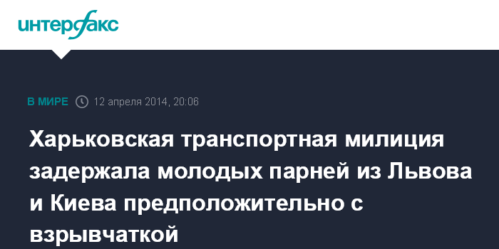 Москва. 12 апреля. INTERFAX.RU - Сотрудники линейного отдела внутренних дел на станции Харьков-пассажирский задержали в поезде четверых мужчин, которые пытались провезти картонную коробку, предположительно с самодельными взрывными устройствами.